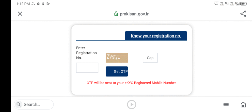 👉इसके बाद आपके सामने एक नया पेज खुलकर आ जाएगा यहां आपको अपना रजिस्ट्रेशन नंबर भरना है इसके बाद कैप्चर कोड को फिल करके Get OTP के बटन पर क्लिक करना है।